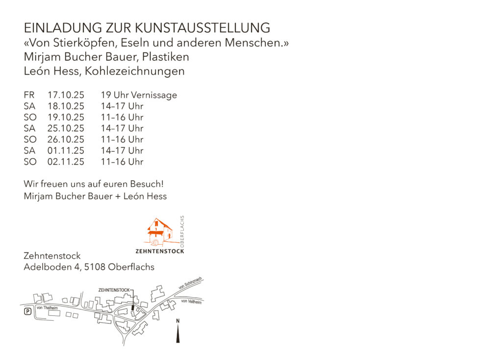 - 17. Oktober bis 2. November: Herbstausstellung „Von Stierköpfen, Eseln und anderen Menschen“ mit Mirjam Bucher Bauer und Léon Hess